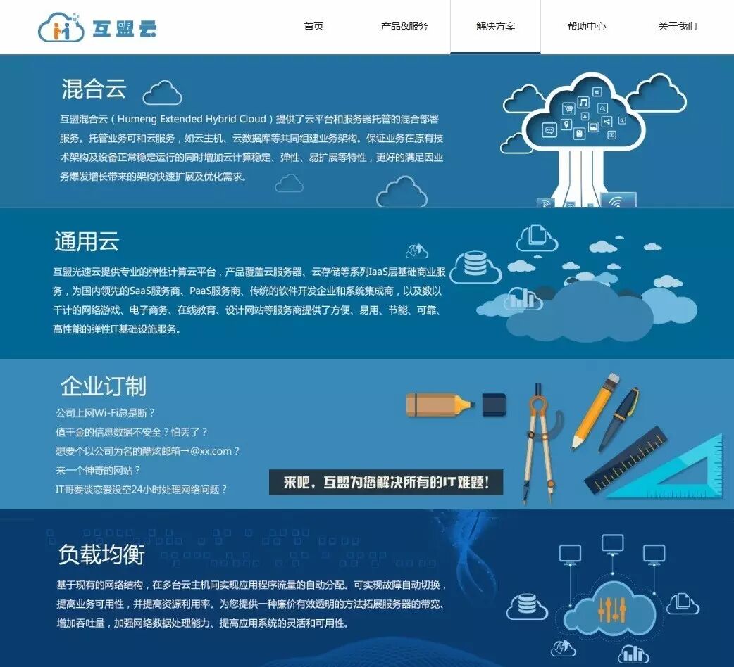 “小萌亲,除了上面所说的,我还想要别的要求,萌萌哒的我怎么办?”小萌告诉您:Don’t Worry!现在为您隆重介绍在互盟官网的菜单条上搔首弄姿的“解决方案”君!他可是集“混合云”、“通用云”、“企业定制”、“负载均衡”的 为一身的大牛!何为大牛?因为它可是敢将四脚朝天的大神牛!