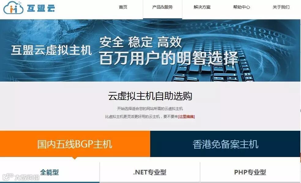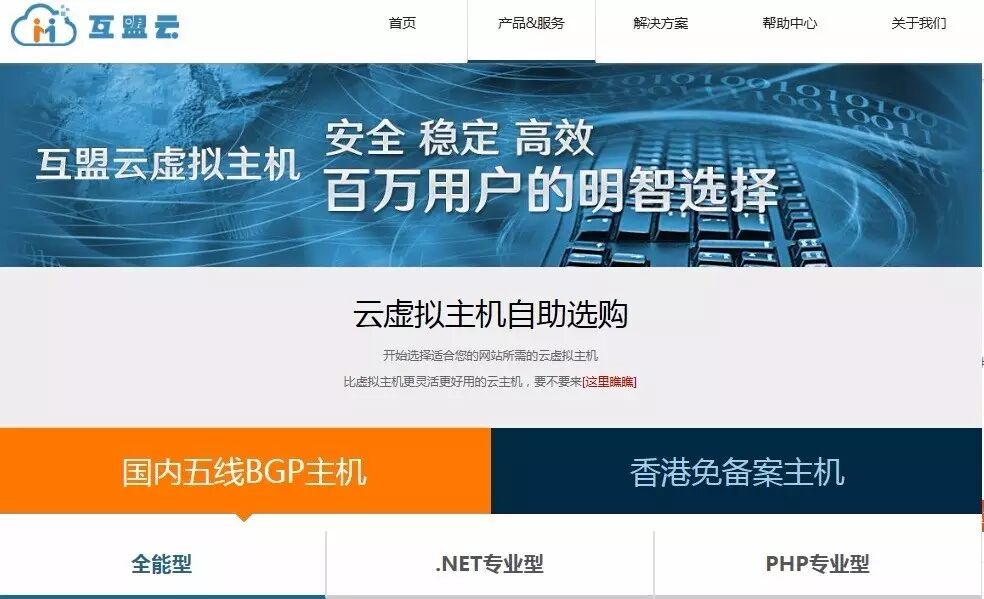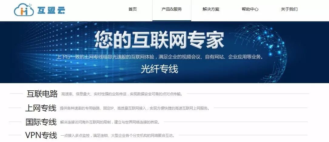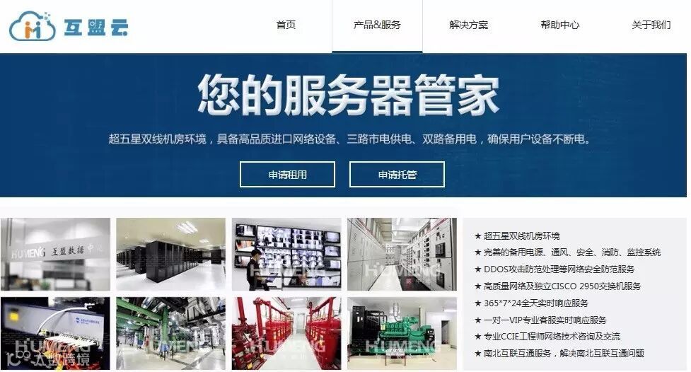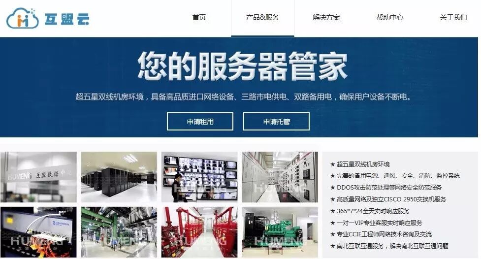 看完首页,是不是有一点动心呢?接下来愉快的调戏一下官网菜单中的“产品&服务”君吧!您会发现,当您为设备的安放愁白了头;当您为云服务的选择伤痛了脑经;当您为各种公司的网络专线犹豫不决;只要调戏完“产品&服务”君这是都不是问题了!要知道互盟可以提供:云服务器、云虚拟机、服务器托管/租用、光纤专线业务、增值服务、CDN加速及一体化的网络解决方案!