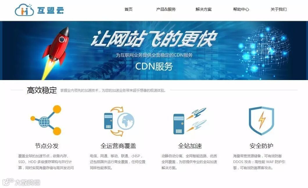 除了上述服务外,互盟还可以为您的互联网业务提供全面稳定的CDN服务,让您享受着业内最稳定与迅捷的加速技术,为您的加速业务带来超乎想象的极速体验,让您的网站飞的更快!光速的感觉根本停不下来!世界触手可及!