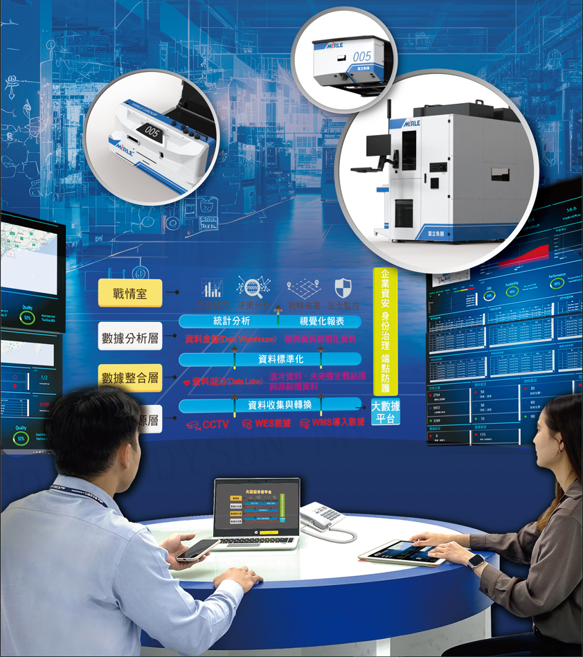 盟立智能工厂战情室能够与自家的AMHS、ERP、WMS、MES等系统串连,将IT端与OT端的数据和讯息进行实时的整合,让制造业能够同时精准掌握订单进度、原料使用状况、生产状况、质量状况等信息,并根据设备的运作状况,调整库存和订单等信息,以达到最佳的生产效果。