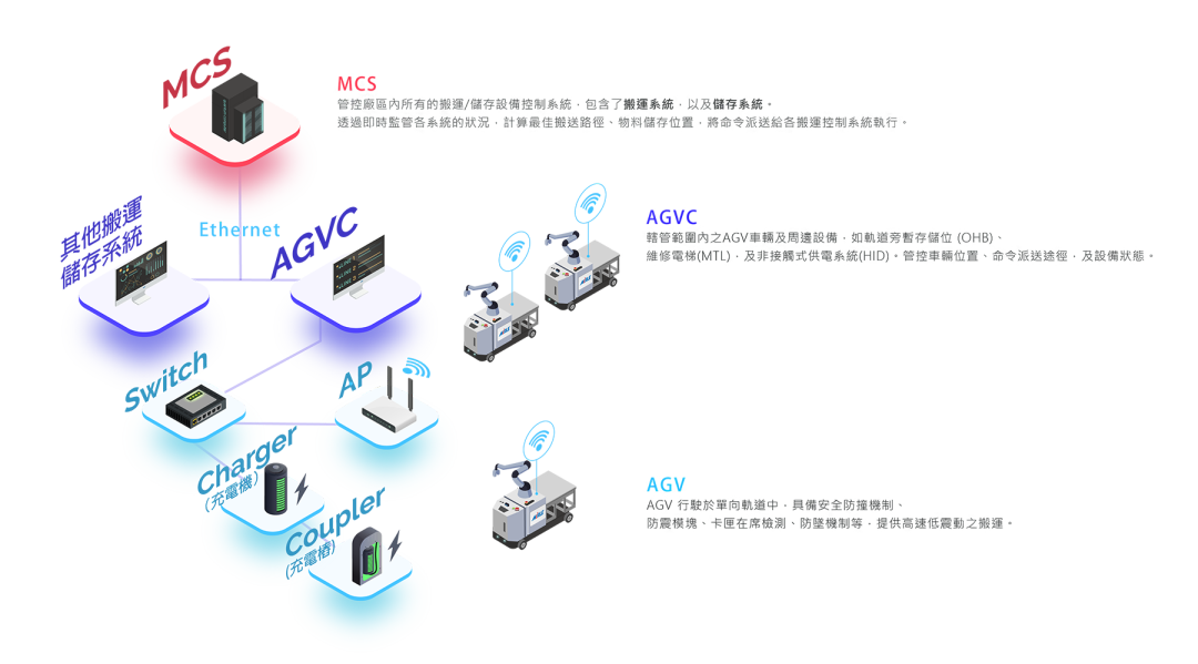 自动物料搬运系统采取分层式控制架构,由上下位控制系统,透过各层的通讯协议,进行物料的搬运及管理。盟立的自动导引搬运车控制系统称为AGVC,其上位控制系统为物料控制系统 (Metrical Control System, MCS),而其管控范围为辖管内的AGV、充电桩。系统架构如下图分层控制架构图所示。