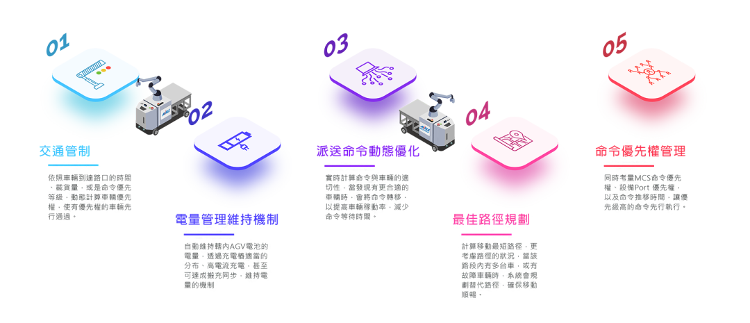 盟立AGVC 除了有基础的数据管理、车辆管控功能之外,更开发了多项智能控制逻辑,如交通管制、电量维持、命令优先权管理、派送优化、实时路径演算,并提供数据分析及接口设备管理的功能。以下将简述五项智能控制逻辑: