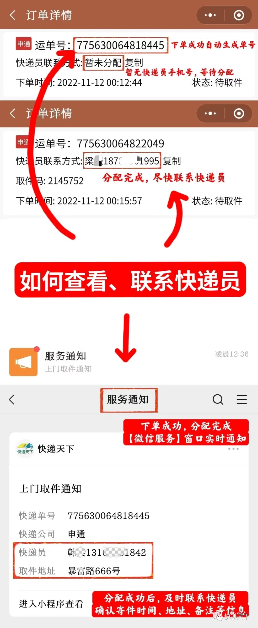 收到通知后,请及时联系快递员,确认寄件时间、地址、备注等信息。
