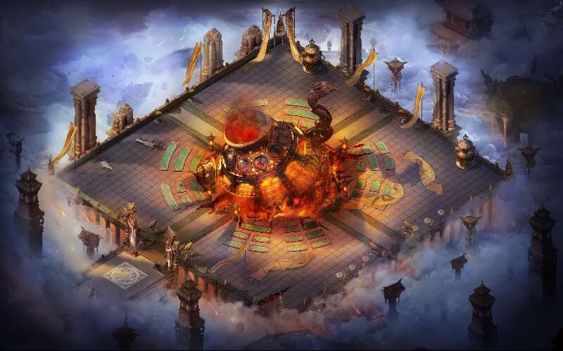 炼丹房作为天庭的一部分,悬浮于云端之上,是一方由整齐石砖铺陈的空中平台。平台四周屹立数根石柱,不同姿态的仙鹤宫灯陈列在丹房内。平台中央由翠玉石砖构成一个八卦阵法,阵心放置着八卦炉,十分醒目。八卦炉炉首呈仙鹤造型,炉身略微倾斜,炉中火焰显喷薄之势,是炼制顶级装备的不二神器。几处符咒飘带凌乱散落在地面上,一侧石柱呈崩塌之势,昭示着这里曾被齐天大圣孙悟空大闹一番。