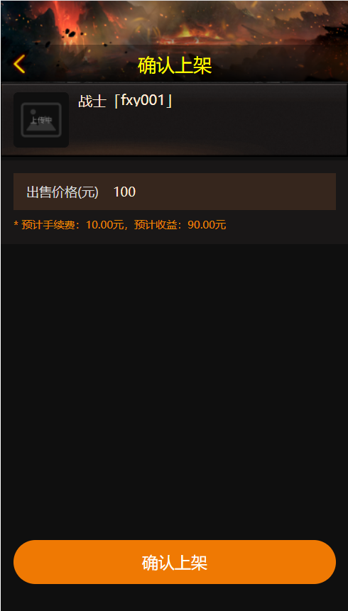 步骤2:选择要出售的角色,进入确认上架页面输入售价;