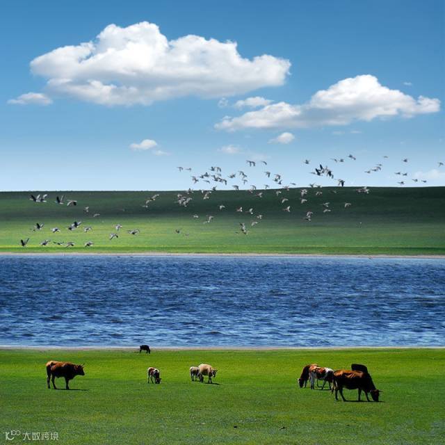 头顶是瓦蓝的天空、洁白的云朵,一排排鸿雁列队飞过,也掠过我的心田;脚下是青翠的牧草、蜿蜒的小河;眼前是散落四处的牛羊……