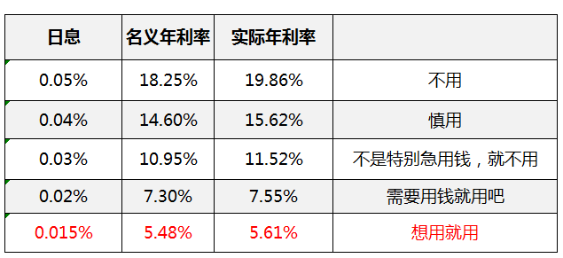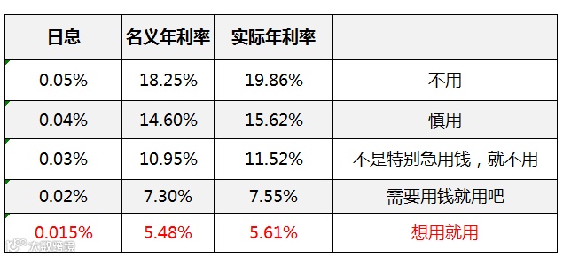 找它们借钱,是按天计息的,一天利息0.015%-0.05%,也就是我们常说的万分之1.5到万分之5。