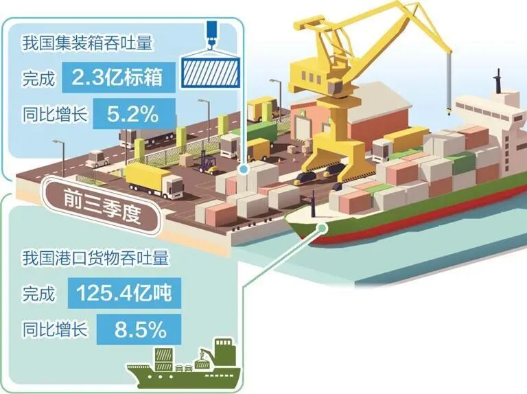 以长江航运为例,前三季度,长江干线港口完成货物吞吐量28.2亿吨,同比增长7.4%;集装箱吞吐量1932万标箱,同比增长7%。