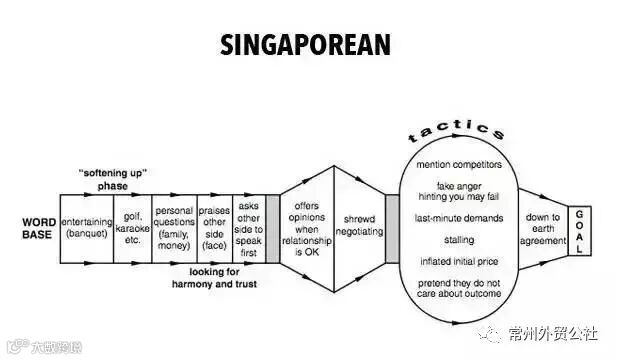新加坡人:喜欢先跟客户打好关系,比如一起去打高尔夫,聊一些家庭问题等来建立双方的信任,然后当确认关系ok时开始谈判。他们谈判中会提到客户的竞争对手,会暗示客户要求无法达到,或者表现出他们丝毫不介意丢掉这一单,直到双方达成一致。