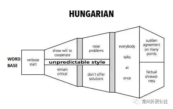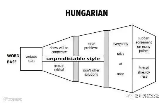 匈牙利人:行事“飘忽”,通常会给客户合作的意愿,但又有所保留,会提出问题不想解决办法。直到最后才会给客户答复,非常精明。