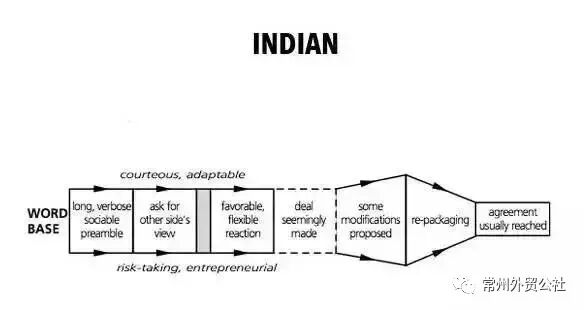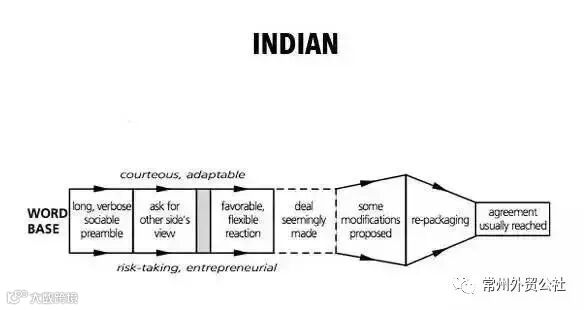 印度人:不直接切入正题,绕个大圈子后询问客户的意见并给出“官方回应”,达成初期协定后再继续重新提出方案计划。