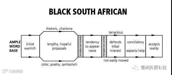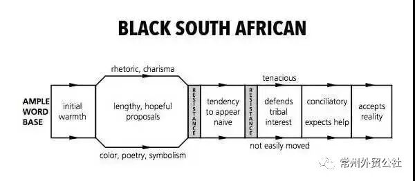 南非人:热情,喜欢提出冗长的提案,谈判过程中对自己的利益寸步不让,使用“怀柔”政策,直到对方同意自己的要求。