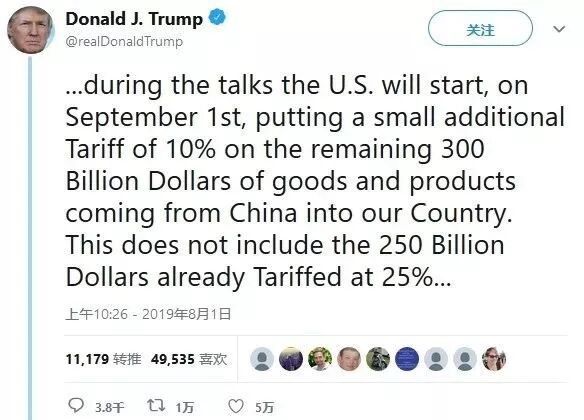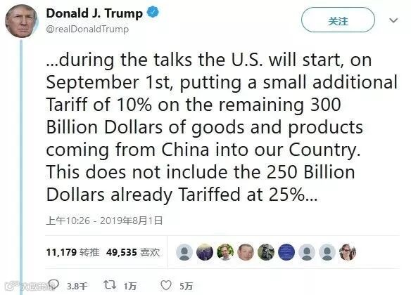 美国时间8月1日下午,在双方第十二轮贸易磋商结束之后的第二天,这位美国总统在推特宣布,将于9月1日起实施这一份3000亿加征关税清单,税率为10%;已实施的2500亿美元加征25%的政策则继续执行。