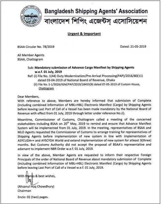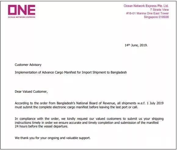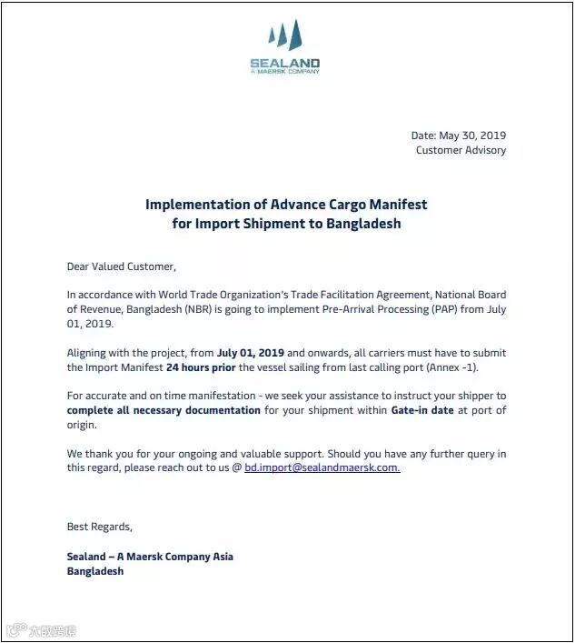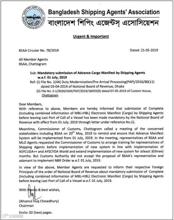 为了提升国际贸易和货物进口清关速度,孟加拉国近日宣布实施预到港处理(PAP),即舱单预申报政策:7月1日起,孟加拉国国家税务局要求必须在最后一个停靠港启航前24小时,提交完整的船舶代理电子舱单信息(含MBL+HBL组合信息)。