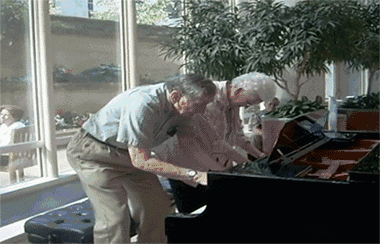 这天他们走进一家餐厅,发现了一架钢琴,两人一拍即合,像孩子一样玩儿了起来,逗得彼此哈哈大笑。