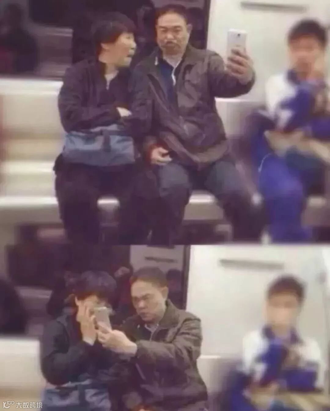 地铁上一对中年夫妻正在玩儿自拍,面对镜头,他们摆出各种搞怪的表情。大叔拍完给妻子看,妻子顿时哈哈大笑。