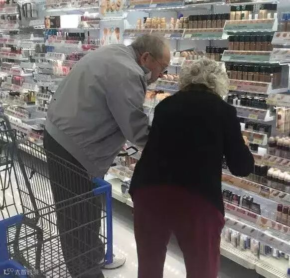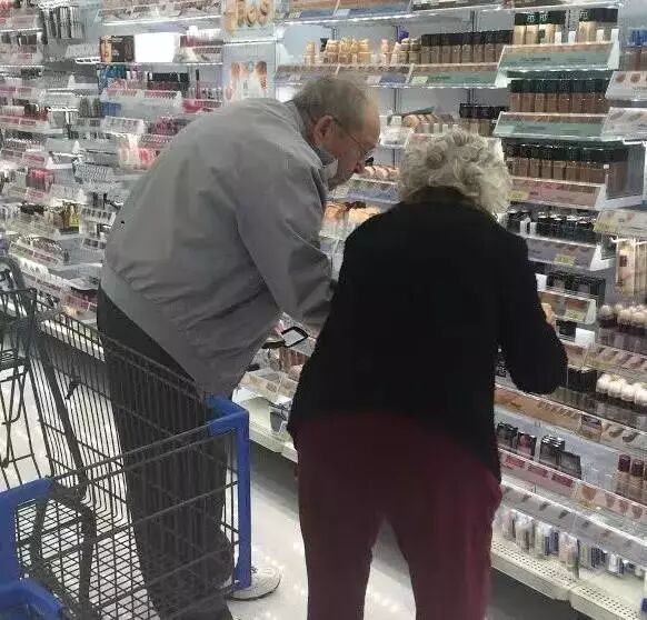 商场里,老爷爷正在帮老奶奶挑选适合她的化妆品。