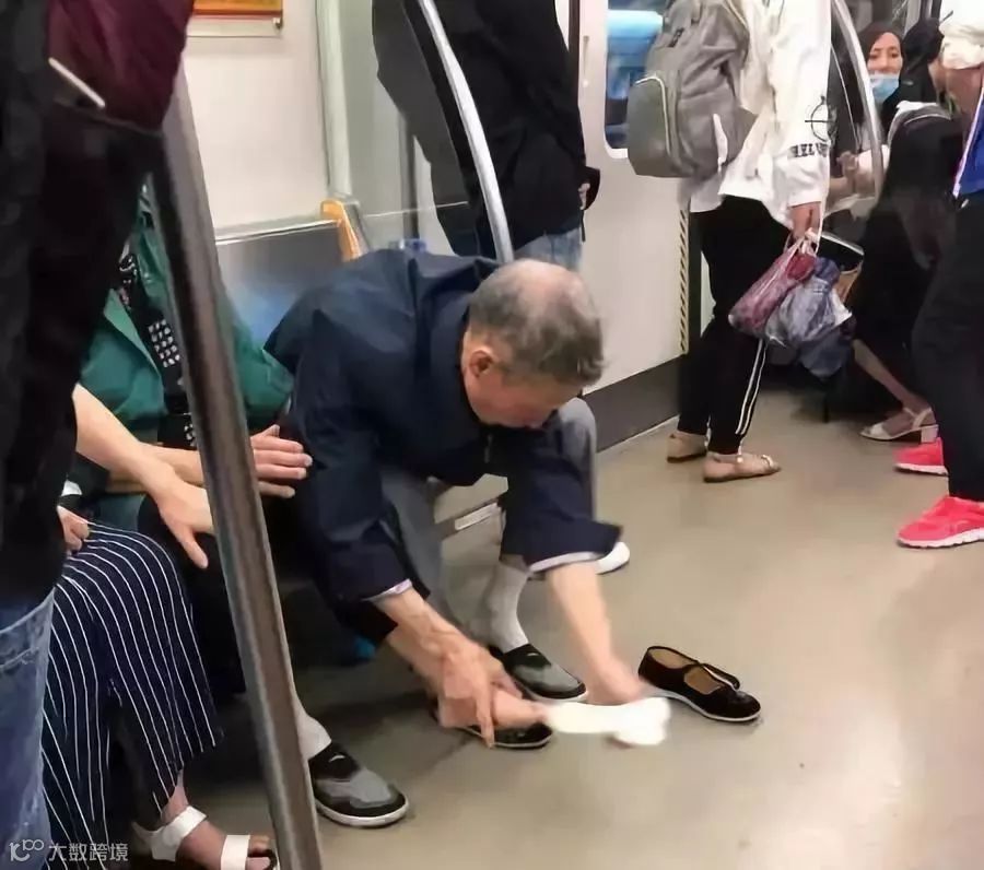 成都地铁上,老奶奶鞋子被雨淋湿了,老爷爷把自己干的袜子鞋子脱下来,温柔地给老伴儿换上,然后把湿透的女鞋穿在自己脚上。