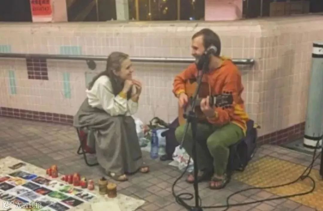 这对流浪情侣,以街边卖艺为生,男人正弹着吉他唱情歌,女人托着下巴,全神贯注地听着。