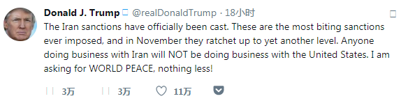 这些是实施过的最严厉的制裁举措,11月还会升级到另一个层级。任何人若与伊朗做生意,就不要再跟美国做买卖。我是为了世界和平,没别的!——特朗普8月7日发表推文称。