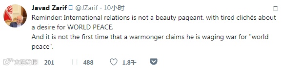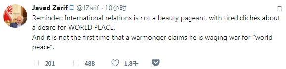 主战者说他发动战争是为了“世界和平”,这已不是第一次了。——伊朗外长扎里夫发表推文回应。