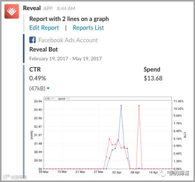 Reveal Bot能够与协作工具Slack集合,通过人工智能向你发送实时的广告活动进展。你可以了解自己的营销广告投放的范围、曝光数、点击数。