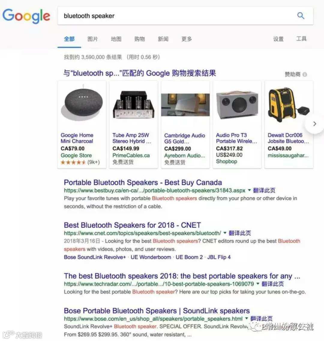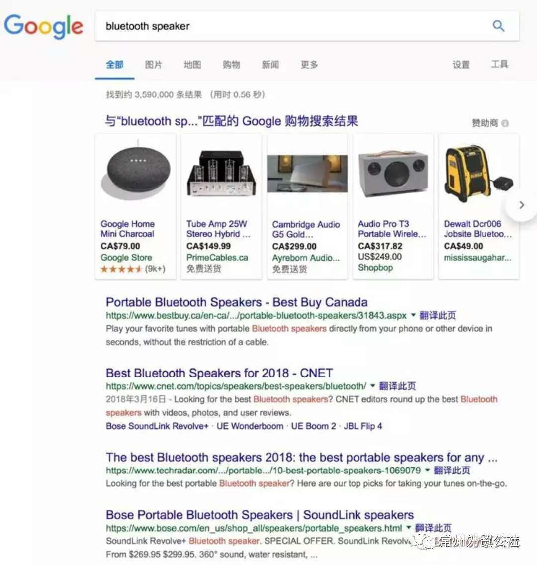 (下图为在谷歌搜索“蓝牙音响”已经在首页看不到任何亚马逊链接的截图)