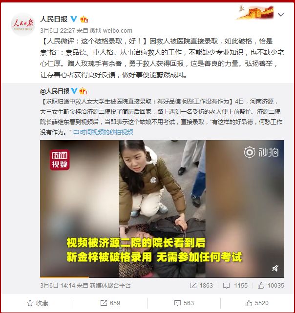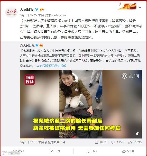 因靳金梓曾在济源二院投递简历,济源二院的院长看到这个视频后,直接说:“不用考试,直接录取,有这样的好品德,何愁工作没有作为。”