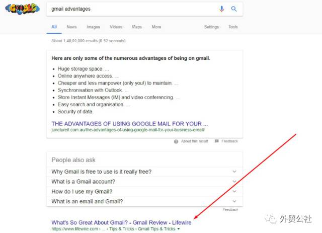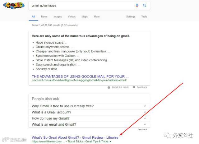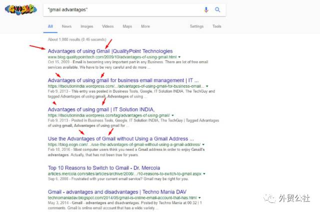 如果你想在谷歌上搜索gmail的优势(Gmail advantages),而你是在没有使用双引号的情况下进行的搜索。但是,你会发现搜索结果显示的是“How good Is Gmail”以及相似的结果。所以,当你在搜索一个关键词时没有使用双引号时,谷歌就会显示出所有相关的结果。