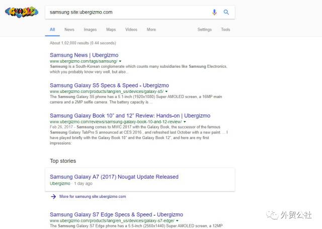 这个技巧几乎和前一个技巧一样。你只需输入——Samsung site:ubergizmo.com,你就可以看到ubergizmo.com上所有提到“Samsung”关键字的网页。
