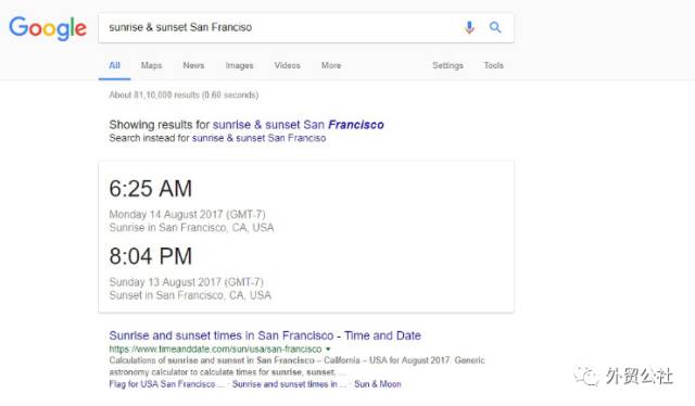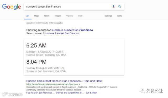 你只要输入“sunrise & sunset San Franciso”之类的字词就行。