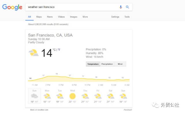 在谷歌搜索时,你只需输入“Weather in+地名”。例如,当你输入“Weather in San Francisco”时,你就会得到如下的结果: