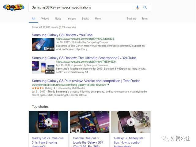 例如,如果你想在谷歌上搜索“Samsung S8 Review”,不希望搜索结果出现描述该设备规格的网页,那么你可以输入“Samsung S8 Review -specs -specifications”。