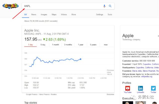 如果你知道一家公司在股票交易市场中的代号,你可以直接在搜索框中输入它,就能直接获取该公司的股票走势图。