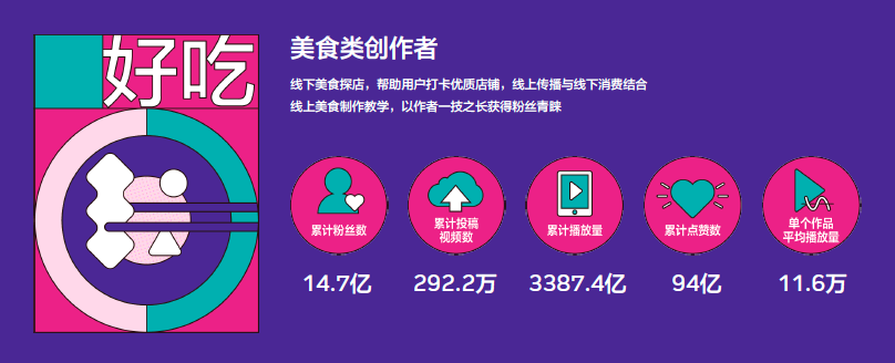 美食类创作者既包括了线下探店打卡的创作者,也有进行美食制作教学的厨艺达人。今年以来这个领域已经积累了14.7亿粉丝,单个作品平均播放量达到11.6万。