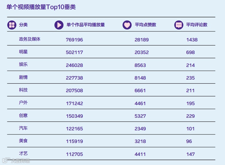 在传播效果方面,表现最好的是政务/媒体类作者,单个作品平均播放量已经达到76.9万,远高于排名第二第三的明星、娱乐类创作者的数据表现。可见短视频平台内容已经非常多元化,严肃正能量内容很受欢迎。