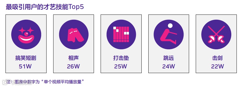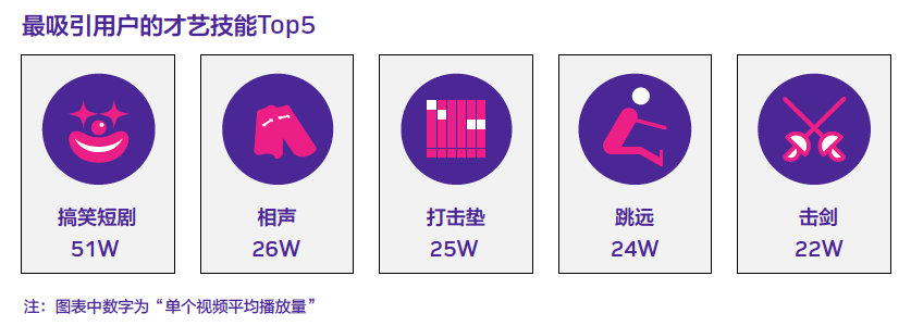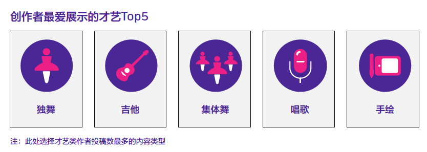 在平民化的内容之外,抖音还聚集了一批身怀各项才艺的创作者。创作者最爱展示的才艺是独舞、吉他、集体舞、唱歌和手绘,整体上以音乐舞蹈等艺术形式为主。而用户爱看的才艺则偏向搞笑短剧、相声、打击垫、跳远、击剑等好玩、新奇、刺激的内容类型。