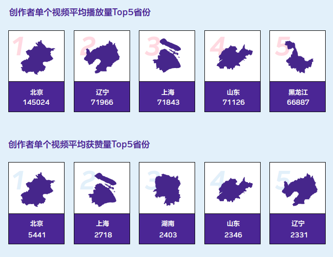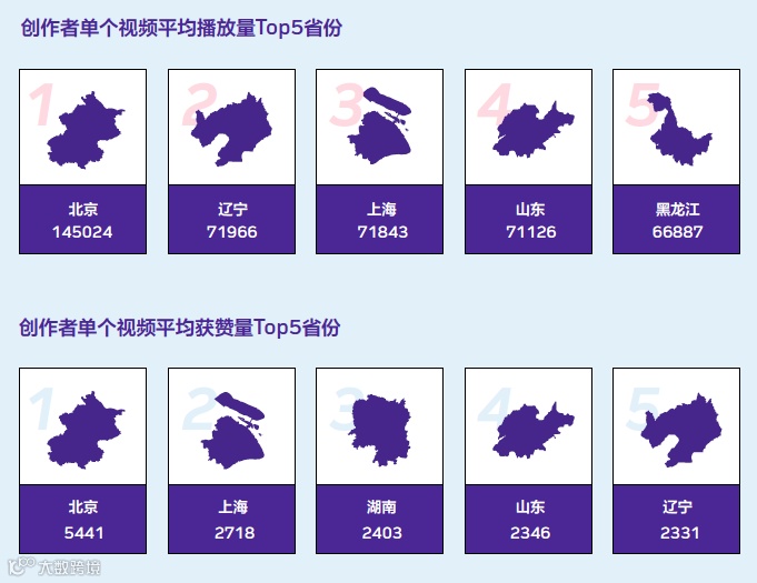 我们从传播效果上进行分析,发现北京的创作者作品传播效果最好,视频条均播放量达到14.5万,每个视频平均获赞数5441个,是第二名的两倍。