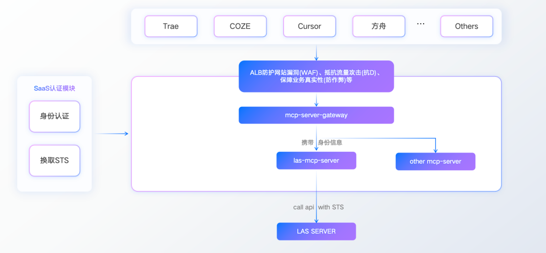MCP是一套标准化数据上下文管理体系,其架构设计包含安全三层防护,用户请求经ALB应用负载均衡器过滤异常流量后,由网关动态路由至最近服务节点并签发STS安全令牌,最终实现私有数据的安全访问。