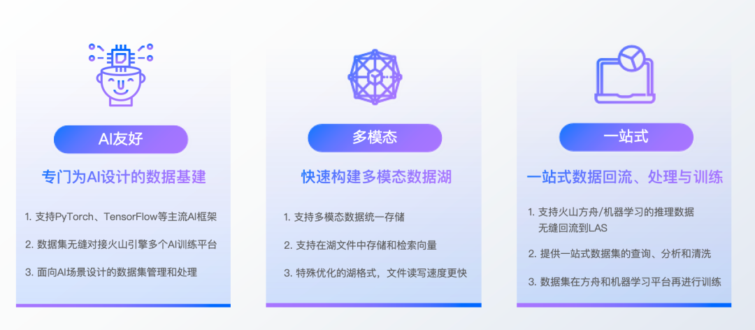 1. AI原生设计:原生支持PyTorch、TensorFlow框架,打通火山引擎训练平台,实现“数据就绪即训练”。