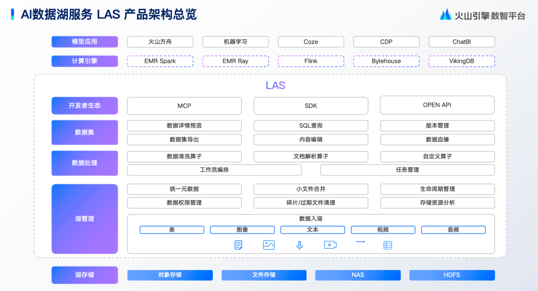 火山引擎LAS平台提出的 Vibe Data Processing 理念,通过Lance存储格式、Ray分布式引擎提升非结构化数据处理效率,特别是自然语言交互内核的设计,显著简化了从数据探索到模型部署的流程。