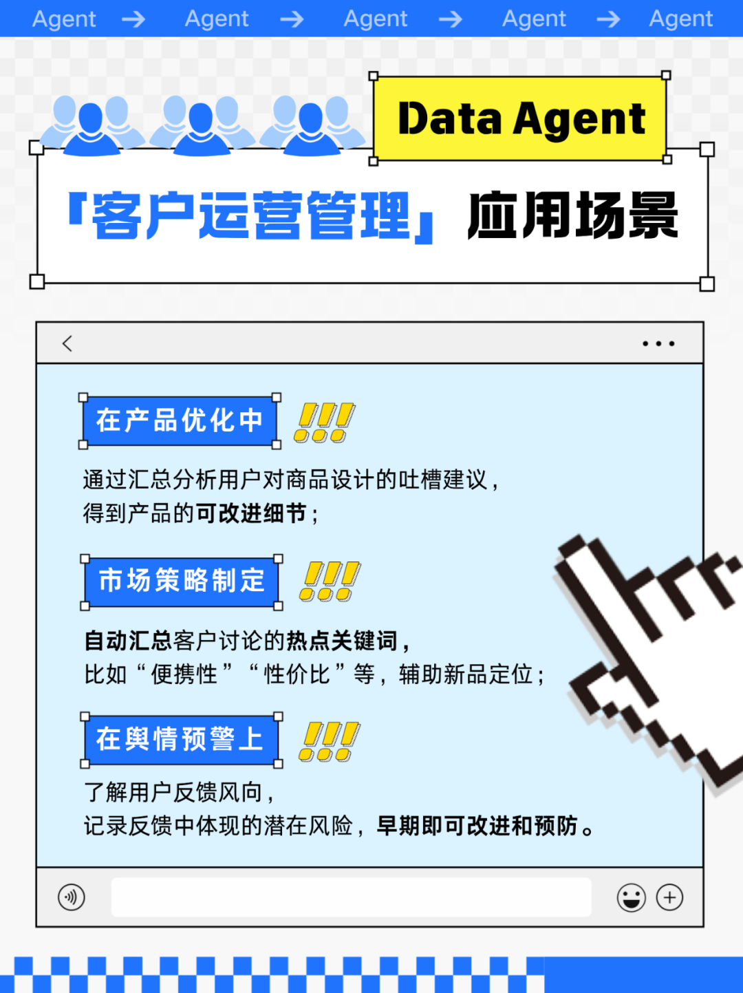 Data Agent推出后,可通过智能分析文本、语音、图片等多种形式的数据,帮助企业更及时地捕捉客户需求与潜在风险。