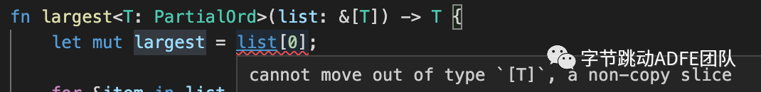 因为 > 这个运算符在 Rust 中被定义为标准库中 trait std``::cmp::PartialOrd 的一个默认方法。所以需要在 T 的 trait bound 中指定 PartialOrd,这样 largest 函数可以用于任何可以比较大小的类型的 slice,当然代码还是会报错: