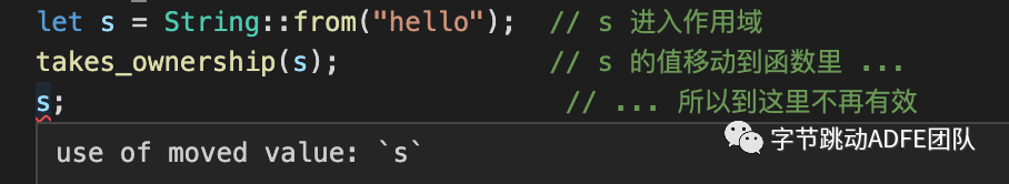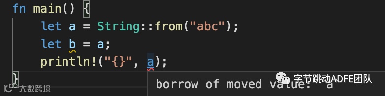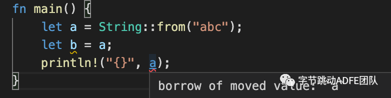 Rust 将这个我们看似平常的赋值语句命名为了 「move」,这里字符串的所有者(owner)从 a 转移(move)到了 b,根据规则 2,a 的所有权将会失效,所以如果代码有对 a 的访问将会直接在编译时被检查出来报错: