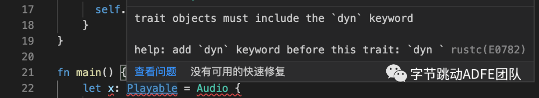 trait Playable {fn play(&self);fn pause(&self) {println!( pause );}fn get_duration(&self) -> f32;}// Audio类型,实现Trait Playablestruct Audio {name: String, duration: f32}impl Playable for Audio {fn play(&self) {println!( listening audio: {} , self.name);}fn get_duration(&self) -> f32 {self.duration}}fn main() {let x: Playable = Audio {name: helloworld.mp3 .to_string(),duration: 30,};}