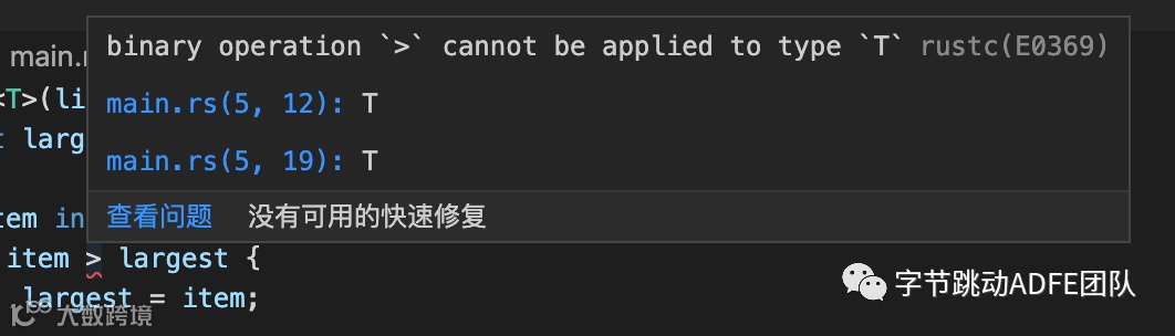 而 Trait 这个概念,为了便于理解,我们可以先想象成接口(Interface),至于接口有什么功能这里就不想赘述了,主要说一下 trait bound,这个概念一般与泛型一起使用,其实我们刚才的第一段 Rust 泛型的示例代码是会报错的,原因在于:
