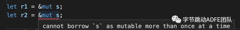 不过,可变引用有一个很大的限制:在同一时间只能有一个对某一特定数据的可变引用。例如一下代码会直接报错:
