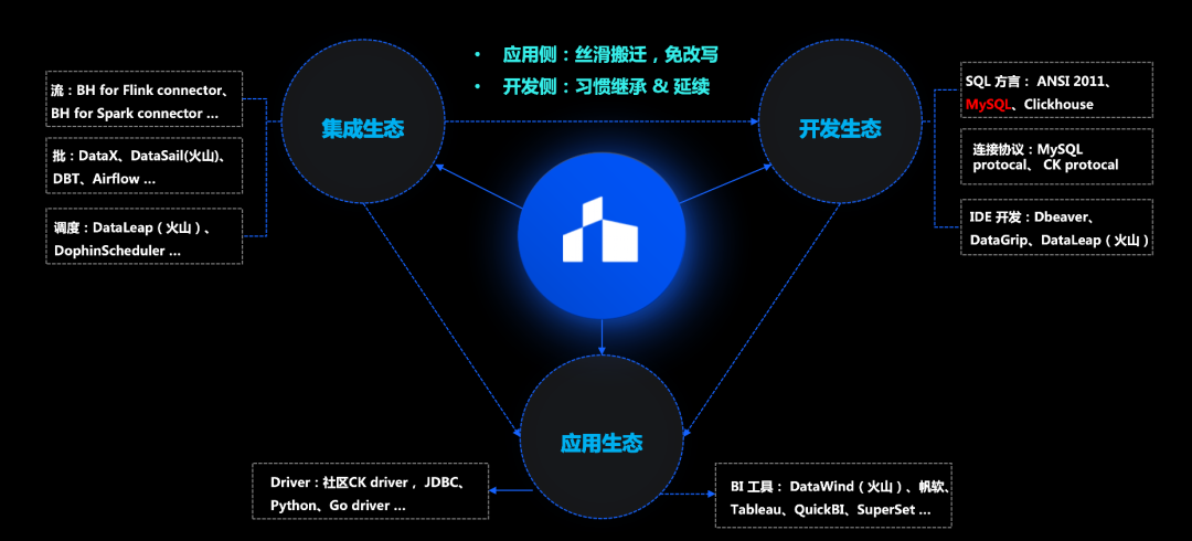 第五个核心能力是生态多元化。OLAP 领域虽然呈现出百花齐放的局面,但主流还是存量场景。为了让更多用户开发者和应用用户从其他平台顺滑迁移到 ByteHouse ,ByteHouse期望能尽量缩减改写和搬迁代价。