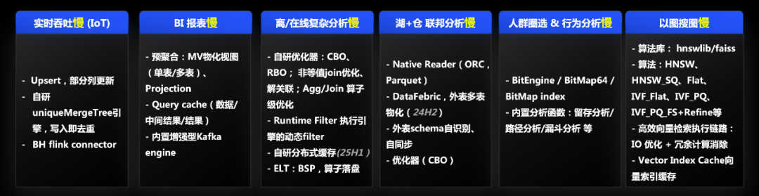 最为首要且关键的核心能力是性能。在 OLAP 领域,性能是一个永恒的追求。在下图的六个场景中,都存在着各种性能问题。