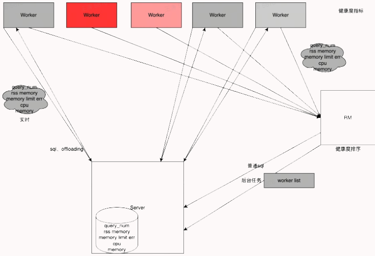 ● 建立 worker 健康度机制。Server 端建立 worker 健康度管理类,可以快速获取 worker group 的健康度信息。包括 cpu、内存、运行 query 数量等信息。